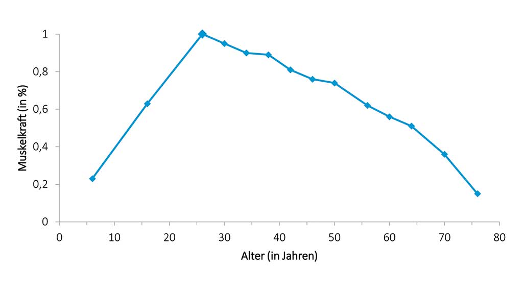 Im Zeitalter des steigenden Bewegungsmangels sinkt die ohnehin altersbedingt abnehmende Muskelkraft deutlich schneller (Abb. 6). Eine zunehmende Einschränkung der Mobilität, kürzere Gehstrecken, vermehrtes Sitzen mit der deutlichen Gefahr weiterer körperlicher Bewegungseinschränkungen bis hin zu Gelenkkontrakturen können die Folge sein.