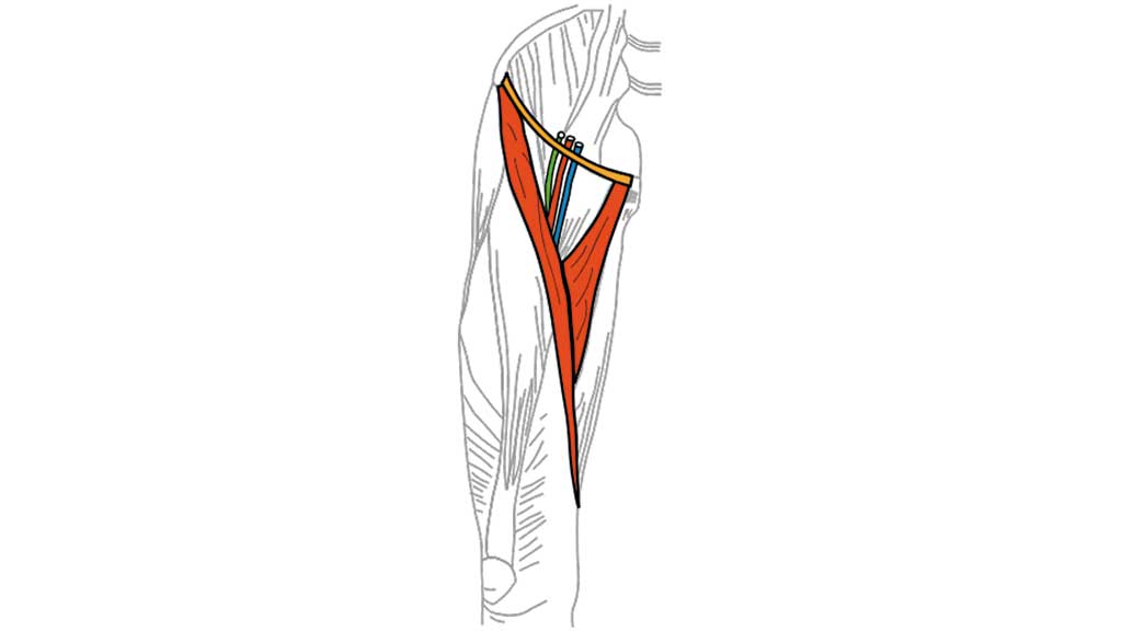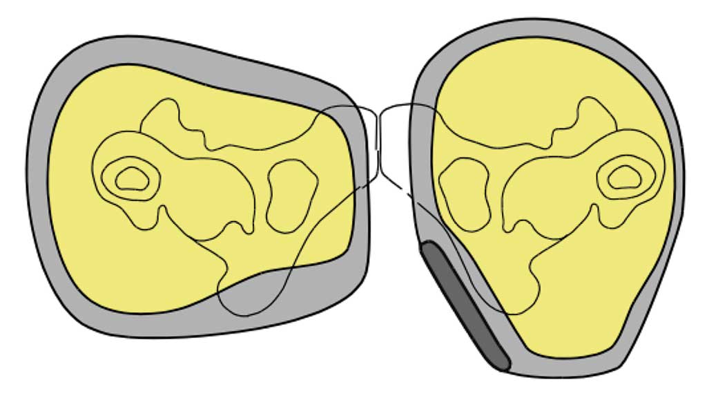Die mit Abstand häufigste Ursache für eine Amputation im Bereich der unteren Extremitäten ist wie beschrieben die irreversibel gestörte Durchblutung unterschiedlicher Genese. Die vom Becken auf den Prothesenschaft wirkenden Kräfte mittels einer Tuberbank des Schaftes abzufangen und zu übertragen hat Folgen: Das Drehzentrum des Hüftgelenkes wird asymmetrisch hin zur Tuberbank nach medial, dorsal und distal verschoben. Die Lage dieses neuen Drehpunktes erzeugt ein beckenvorkippendes Moment. Um dem zu begegnen und das Abgleiten des Stumpfes nach ventral und distal zu vermeiden, ist ein vorderer Gegenhalt in Form einer frontalen Pelotte im oberen vorderen Schaftbereich zu integrieren. Diese Pelotte erzeugt nun mit ihrem permanenten Druck das gewünschte entgegengesetzte Drehmoment, gleichzeitig drückt sie auf die im Scarpa-Dreieck unmittelbar unter der Haut verlaufenden Gefäß- und Nervenstrukturen mit Hauptarterie und ‑vene (Abb. 7). Hinzu kommen Druckspitzen unter dem Tuber os ischii und im Perineumbereich eine Verdrängung mit anschließender Atrophie der Muskulatur.