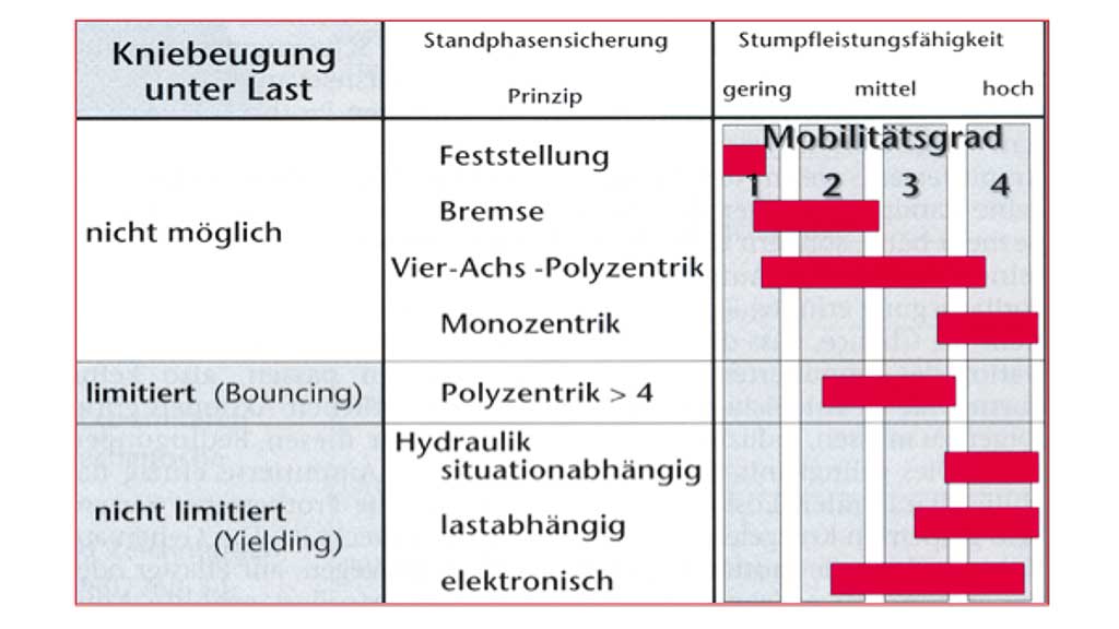 Heutige Kniegelenke besitzen zusätzliche Sicherungen und beeinflussende Wirkmechanismen, die den Einsatz bei Geriatrikern gut ermöglichen. Die Standphase kann durch mechanische Systeme (Sperre oder lastabhängige Bremse) gesichert werden. Eine Sperre stellt in einer Interimsversorgung eine temporäre oder bei sehr unsicheren Patienten der Mobilitätsklasse 1 durchaus eine definitive Lösung dar. Eine lastabhängige Bremse sichert den Fersenauftritt, kann jedoch den Nachteil haben, dass bei Zehenlösung entweder ein großes Hüftflexionsmoment benötigt wird oder die amputierte Körperseite durch Anheben der Hüfte entlastet werden muss. Der metabolische Umsatz des Amputierten steigt dadurch. Vorteilhaft sind hier die Bremssysteme, die ab der mittleren Standphase das Gelenk bereits freigeben.
