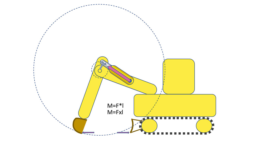 Betrachtet man den wirksamen Hebelarm einer Linearhydraulik in unterschiedlichen Winkelstellungen, so fällt auf, dass der Hebel am Baggerarm immer kürzer wird, je mehr sich das Gelenk der Streckstellung nähert. Ist die vollständige Streckung erreicht, kann die Hydraulik kein Moment mehr auf den Löffelarm ausüben (Abb. 11a). Diese Position wird in der Mechanik als Totpunkt bezeichnet. Überträgt man diese Betrachtung auf das prothetische Kniegelenk, dann wird dort der Totpunkt in der Beugestellung erreicht (Abb. 11b), während der Hebelarm in der Streckstellung maximal ist (Abb. 11c). Der in Streckstellung lange Hebel bietet Vorteile für die Feinjustierung der Anschlagsdämpfung in der terminalen Schwungphase. Andererseits ist das erforderliche Moment, um das Knie gegen Einbeugen zu sichern, am gestreckten Knie relativ gering und wird bei zunehmender Beugung unter Last größer. Das führt zu der theoretischen Überlegung, den Anlenkpunkt der Hydraulik weiter nach vorne und gleichzeitig weiter nach oben zu verlegen. Dadurch würde der wirksame Hebelarm in der Streckstellung kürzer und würde sich bei zunehmender Beugung vergrößern. Dies hätte jedoch gleichzeitig zur Folge, dass sich die Aufbauhöhe oberhalb der Gelenkachse vergrößert und das Gelenk somit für lange Stümpfe weniger geeignet wäre.
