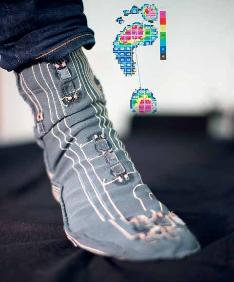 Damit sich schlecht heilende Wunden gar nicht erst bilden, haben Forscher mit Unterstützung von Industriepartnern und Kollegen des Fraunhofer-Instituts für Integrierte Schaltungen IIS in Erlangen einen Spezialstrumpf mit integrierten Sensoren entwickelt (Abb. 1). Insgesamt 40 sehr dünne dielektrische Elastomersensoren messen lokal die Druckbelastung und ‑verteilung an medizinisch relevanten Stellen am Fuß und übernehmen so die Funktion der Nerven. Bisherige Systeme sind als Einlegesohlen auf dem Markt und messen nur die Druckverteilung an der Unterseite des Fußes. Die neuartigen Sensoren hingegen sind an der Strumpfsohle, der Ferse, den Zehen, dem Fußspann und dem Knöchel angebracht und zeichnen die Signale daher am kompletten Fuß auf. Die Forscher haben den Druckmessstrumpf bereits zum Patent angemeldet.