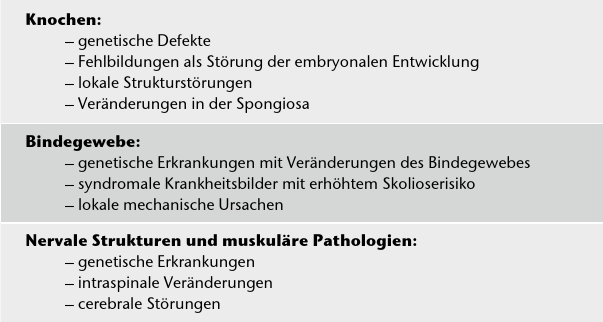Eine in der Adoleszenz diagnostizierte Skoliose wird meist als „idiopathische Skoliose” bezeichnet. Mit dieser Diagnose wird allerdings der falsche Eindruck erweckt, es handle sich um eine eigenständige, unifaktorielle Erkrankung. Vielmehr muss davon ausgegangen werden, dass es sich dabei um Skoliosen verschiedener Ursachen handelt, die in der Adoleszenz erstmalig diagnostiziert werden (Tab. 1).