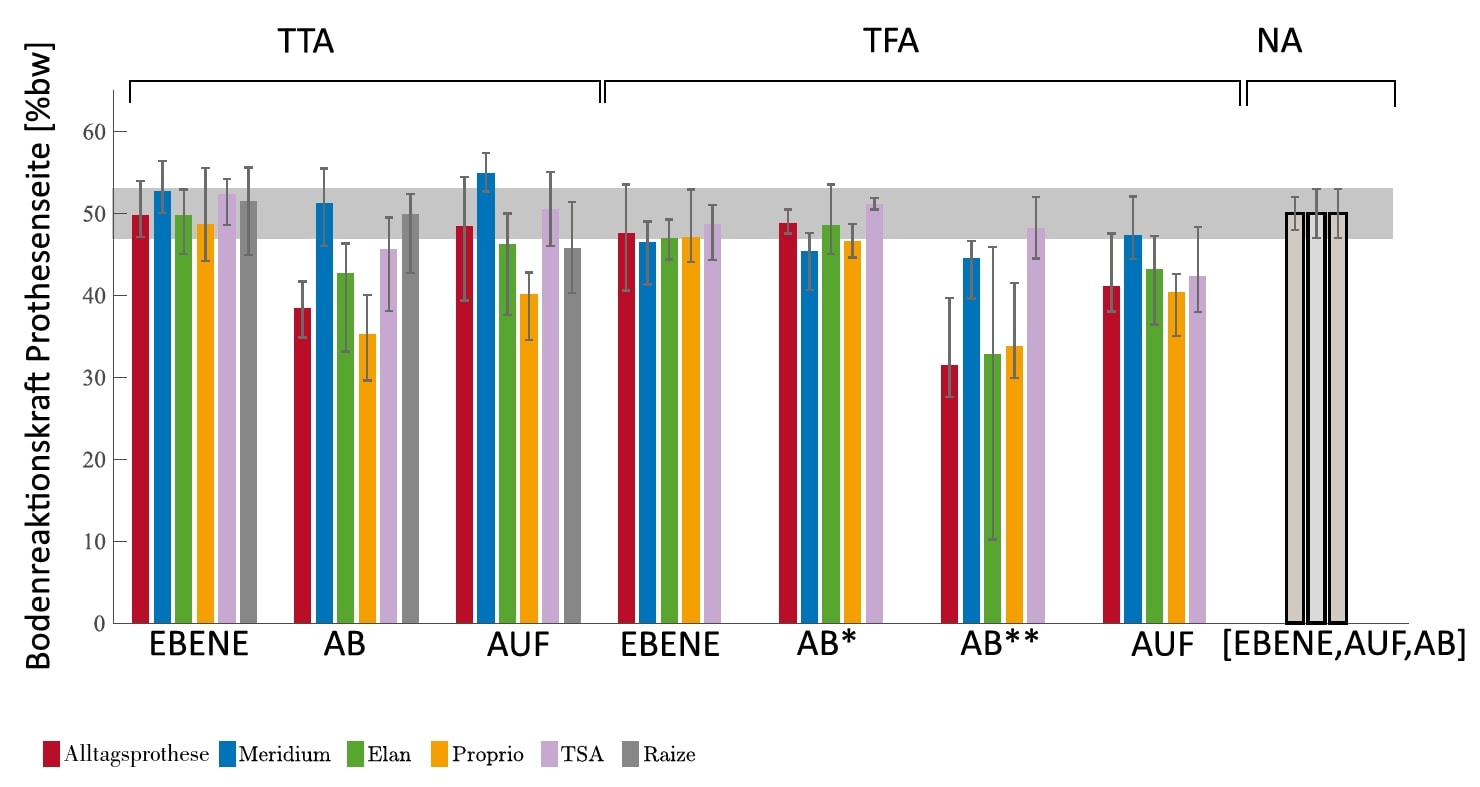 Jeweils vier einseitige TTA- und TFA-Probanden nahmen an der Studie teil (TTA: Alter 56,2 ± 12,0 Jahre, Masse 79,8 ± 8,1 kg, Körpergröße 178 ± 4 cm; TFA: Alter 44,5 ± 3,0 Jahre, Masse 81,9 ± 8,0 kg, Körpergröße 178 ± 7 cm). Die Probanden waren mindestens seit 3 Jahren amputiert und ließen sich in die Mobilitätsgrade 3 und 4 einordnen. Alle waren mit nicht-mikroprozessorgesteuerten Prothesenfüßen (ESR) und die TFA-Gruppe mit mikroprozessorgesteuerten Kniegelenken vorversorgt. Als Referenz diente eine Kontrollgruppe von Nichtamputierten (NA). Die Studie wurde von der lokalen Ethikkommission der Universitätsmedizin Göttingen (UMG) genehmigt und in Übereinstimmung mit der Deklaration von Helsinki durchgeführt.