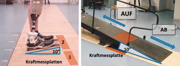 Bei allen Füßen wurden Stehen und Gehen in unterschiedlichen Situationen untersucht. Das Stehen wurde auf ebenem Untergrund („EBENE“), an einer 10° ansteigenden Rampe („AUF“) und an einer 10° abfallenden Rampe („AB“) untersucht (Abb. 1a). Das Gehen wurde ebenfalls an einer 10°-Rampe für die Situationen bergauf („AUF“) und bergab („AB“) untersucht (Abb. 1b). Die Bodenreaktionskräfte wurden beim Stehen mit zwei Kraftmessplatten (Kistler, Schweiz) (s. Abb. 1a: jeweils das rechte und linke Bein separat) und für das Gehen mit einer Kraftmessplatte (s. Abb. 1b) aufgezeichnet. Kinematische Daten definierter Positionen am Körper wurden mit 12 Vicon-Kameras (Vicon Motion Systems, Großbritannien) gemessen. Die kinematischen und kinetischen Daten wurden prozessiert und folgende biomechanische Parameter berechnet: