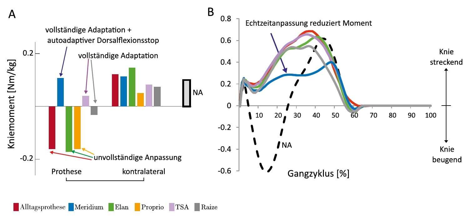 Eine natürlichere Körperhaltung für Beinamputierte ist sowohl durch eine symmetrische Verteilung der Bodenreaktionskräfte zwischen Prothesenseite und kontralateraler Seite als auch durch Gelenkwinkel und Gelenkmomente vergleichbar mit denen von Nichtamputierten gekennzeichnet. Nur einer der fünf untersuchten MP (Meridium) war in der Lage, dies vollständig zu gewährleisten 10. Für die anderen MPF wurden benutzerspezifische Kompensationsstrategien beobachtet, die auf eine unzureichende Anpassungsfähigkeit zurückgeführt werden konnten und diese ausgleichen. In der Untersuchungsgruppe führte dies zu großen interindividuellen Variationen in der Haltung, die nicht mehr auftraten, wenn die Amputierten mit einem geeigneten MPF versorgt wurden (Abb. 4) 11.