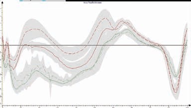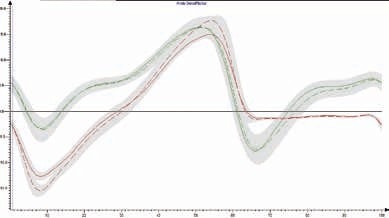 Dies wird bei der Betrachtung der Kniewinkelverläufe (s. Abb. 4) ebenfalls deutlich. Diese zeigen für die versorgte Seite ein höheres Maß an Knieflexion zum Zeitpunkt der Belastungsübernahme bis hin zur frühen mittleren Standphase sowie in der mittleren Schwungphase. Auch zeigen die Winkelverläufe des OSG (s. Abb. 5) einen größeren Bewegungsumfang für die versorgte Seite mit reduziertem Schaftzuschnitt. Die Vergrößerung des Bewegungsausmaßes kann an dieser Stelle als Zunahme an Gangdynamik verstanden und in Anlehnung an die Kriterien nach Wetz et al. (2002) 7 als positiv für den Patienten bewertet werden.