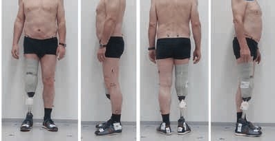 Im Vorfeld der Untersuchung wurde für die Probanden eine Prothese mit konventionellem Schaftrandzuschnitt angefertigt und angepasst (Abb. 1). Diese bestand aus einem Testschaft, einer Modular-Rohrverbindung und einem individuellen Fußpassteil. Die Stumpfbettung erfolgte zweckformorientiert in Verbindung mit einem 3 mm dünnen TPE-Cushion-Liner. Die Haftung wurde durch ein Ausstoßventil und eine Kniekappe gewährleistet.