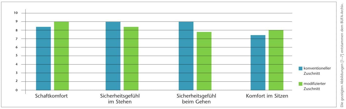 Die Ergebnisse der Befragung (Abb. 7) zeigen, dass die Probanden im direkten Vergleich beider Schaftrandzuschnitte zueinander im Durchschnitt 8 Punkte auf der Skala von 1 („schlechter“) bis 10 („besser“) angaben. Des Weiteren zeigen die Ergebnisse des Fragebogens eine geringfügig höhere Bewertung des Komfort-Aspektes beim modifizierten Schaftrandzuschnitt. So wurde im Durchschnitt der Schaftkomfort mit + 0,4 Punkten und der Komfort im Sitzen mit + 0,6 Punkten gegenüber dem konventionell gestalteten Schaft bewertet. Dagegen wurde der Aspekt der Sicherheit als geringer bewertet: So wurde das Sicherheitsgefühl im Stehen durchschnittlich mit ‑0,4 und das Sicherheitsgefühl beim Gehen mit ‑1,2 Punkten im Vergleich zum konventionellen Schaftzuschnitt angegeben.