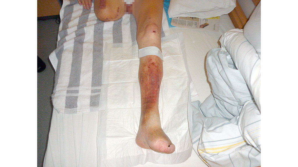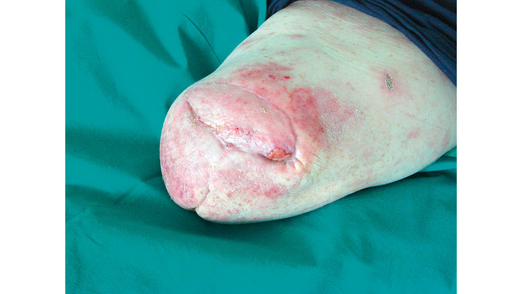 Der Patient M. W. (Abb. 4) musste sich mit 76,8 Jahren einer Oberschenkelamputation rechts wegen einer pAVK Stadium IV mit ausgeprägter Plantarnekrose und livide verfärbten Zehen unterziehen. Es bestand bereits eine Vorfußamputation links. Wegen einer chronisch venösen Insuffizienz Grad III musste am erhaltenen Bein eine offene Wundbehandlung erfolgen. Bis zur Entlassung konnten geschlossene Wundverhältnisse am erhaltenen Bein erzielt werden (Abb. 5).