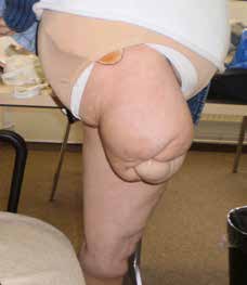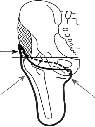 Wie lauten dagegen die Voraussetzungen für die Schafttechnik bei Adipositas-Patienten? Die Ansprüche an die Funktionalität sind genauso hoch wie im Normalfall. Die Stumpfverhältnisse sind aber andere, da die Muskulatur in der Regel nicht so gut definiert ist und durch Fettgewebe überdeckt und ersetzt wird. Eine weitere Schwierigkeit sind Narbeneinzüge, die bei adipösen Patienten oft exponiert vorhanden sind, da die kontrakte Narbenhaut sich nicht mit der restlichen Haut ausdehnt. Tiefe Einschnitte und Furchen sind daher z. B. beim adipösen Oberschenkelstumpf oft vorzufinden (Abb. 2a u. b). Die Weichteile am Stumpf ermöglichen nur einen schlechten Zugang zur knöchernen Struktur des Stumpfes (Abb. 2b u. 3). Es ist dann nahezu unmöglich, eine mediolaterale Stabilisierung durch das sogenannte „Bony-Lock“ („knöcherner Verschluss“) zu erzielen, bei dem es im Steuerungsbereich und der Eintrittsebene des Schaftes zu einer Führung zwischen dem medialen Ramus des Os ischii und dem lateralen Trochanter major kommt (Abb. 4). Im Idealfall erzeugt das Anspannen der Muskulatur im Schaft aufgrund der engen Führung eine Seitstabilität, die keine oder nur eine geringe Shift-Bewegung in der M‑L-Ebene im Moment der Standphase zulässt. Je weniger die anatomische Struktur des Stumpfes im Schaft abgebildet werden kann, umso schwieriger ist die Übertragung der muskulären Kräfte im Schaft. Kraft- und Gewichtsübernahme finden vermehrt durch Weichteile im Schaft statt.