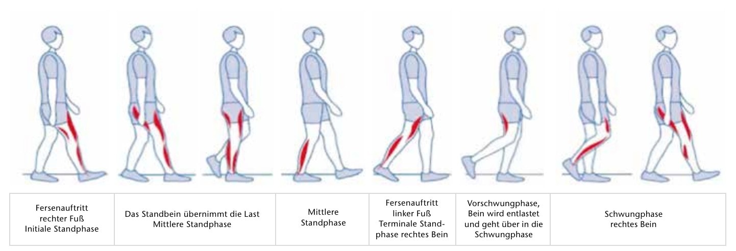 Auch bei nichtamputierten Adipositaspatienten ist der Gangzyklus mit der bekannten Einteilung in 8 Phasen (Abb. 1) beeinträchtigt. Eine Beinamputation verstärkt diesen Effekt, vor allem, weil der Patient vor und nach der Amputation – z. B. durch lange Liegezeiten – seine Beweglichkeit und Aktivität zunehmend verliert. Jedoch muss hier hinsichtlich des tatsächlichen Übergewichts und auch der Körperform differenziert werden: Je größer zum Beispiel der Umfang beider Oberschenkel ist, desto schwieriger wird das achsengerechte Erreichen eines physiologischen Gangbildes vom Fersenauftritt bis zur Zehenablösung sein. Je langsamer sich der Betroffene fortbewegt, je größer sein Körpergewicht und sein Körper- und Beinumfang sind, desto mehr werden sich die Gangphasenabläufe auf die mittlere Standphase konzentrieren. Das Gehen wird also mehr ein „Stapfen“ sein und weniger ein Abrollen mit progressiver Vorwärtsdynamik. Die physiologischen Phasen des Schrittes teilen sich in solchen Fällen zu etwa 60 % in die Standphase und zu 40 % in die Schwungphase auf. Bei schweren Adipositas-Patienten steigt der prozentuale Anteil der Standphase zu Ungunsten der Schwungphase noch weiter an.