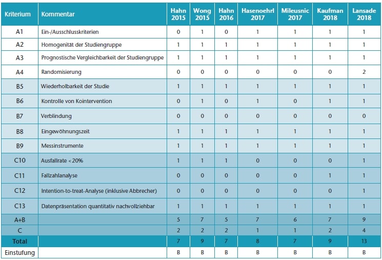Nach der Sichtung der Publikationen in Bezug auf ihre Relevanz für diese Analyse wurden die methodische Qualität und das Risiko einer Verzerrung der Ergebnisse (Bias) separat von beiden Autoren mittels der von Hofstad et al. 44 veröffentlichten Checkliste eines systematischenCochrane-Reviews über rothetische Knöchel-Fuß-Mechanismen beurteilt. Die Checkliste von Hofstad et al. umfasst 13 methodische Qualitätskriterien, die sich auf die Patientenauswahl, die Qualität und die Wiederholbarkeit des Studiendesigns sowie auf die statistische Validität der Daten beziehen. Die identifizierte gesundheitsökonomische Studie (siehe unten) wird ohne eigene Methodenbewertung diskutiert.