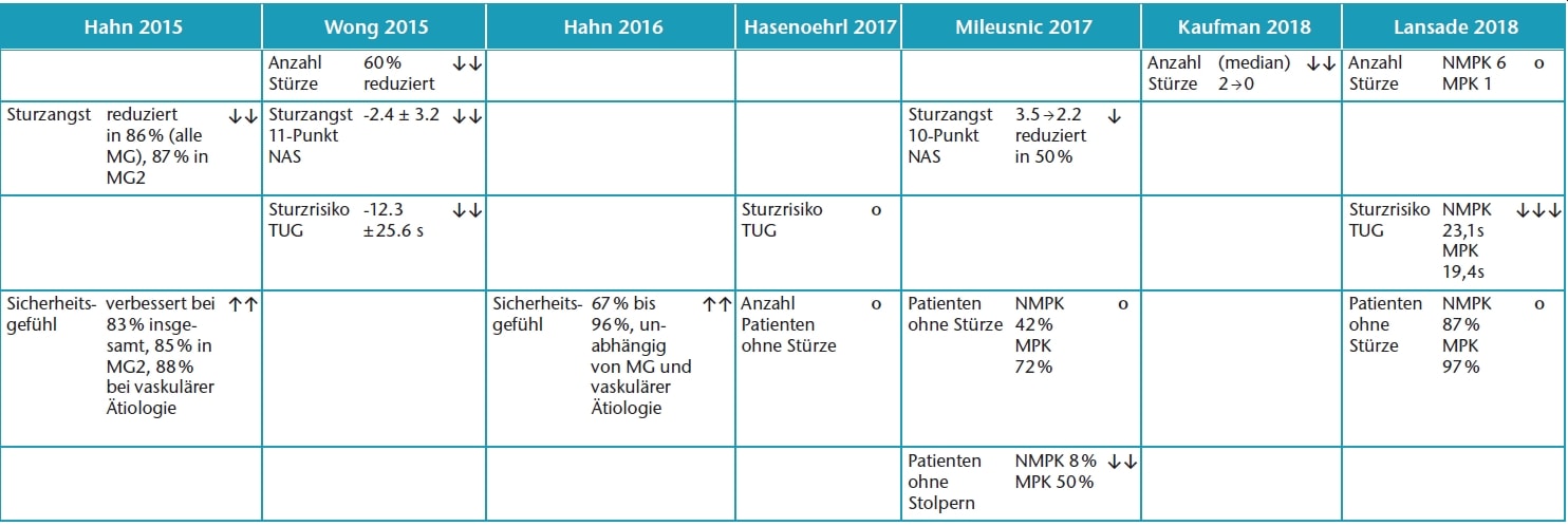 Hasenöhrl et al., Mileusnic et al. und Lansade et al. berichten jeweils über eine in den jeweiligen Studien nichtsignifikante Zunahme der Anzahl der Personen, die mit einem MPK nicht mehr stürzen. Mileusnic et al. berichten außerdem über eine signifikante Erhöhung der Anzahl von Personen, die mit „Kenevo“ nicht mehr stolpern.