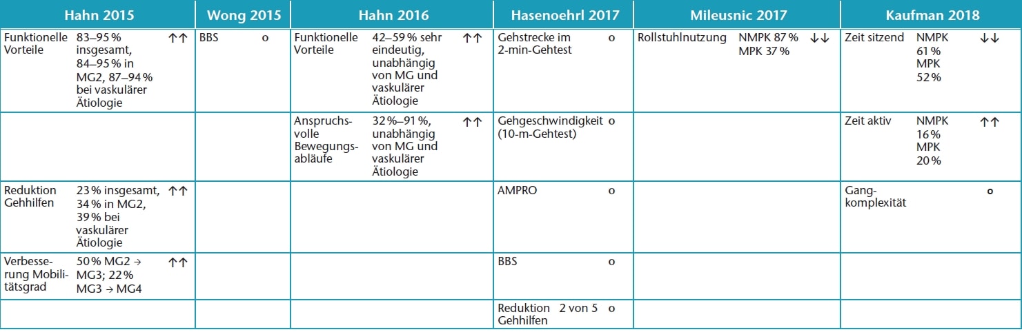 So berichten Hahn et al. 124 125 über ähnliche Verbesserungen in der Zuordnung der Mobilitätsgrade wie Kahle et al. 126 sowie Hafner und Smith 127 . Jeweils 50 % der der Mobilitätsklasse 2 zugeordneten Patienten erreichen mit einem MPK den Wechsel in die Mobilitätsklasse 3.