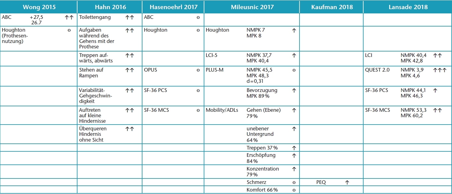 Lansade et al. 69berichten über hochsignifikante Verbesserungen der Versorgungszufriedenheit mit „Kenevo“ im validierten QUEST‑2.0‑Fragebogen (p = 0,001). Signifikante Verbesserungen berichten Lansade et al. auch bezüglich der subjektiv wahrgenommenen Mobilität mit „Kenevo“ im Locomotor Capability Index 5 (LCI‑5: p = 0,02) und im SF-36 Mental Component Score (MCS: p = 0,03). Kaufman et al. 70 ermitteln signifikante Verbesserungen der Zufriedenheit mit der Prothesenfunktionalität im Prosthesis Evaluation Questionnaire (PEQ: p = 0,01), während Wong et al. 71 eine signifikante Verbesserung des mittels Activity-specific Balance Confidence (ABC) Scale gemessenen Gleichgewichtsempfindens mit dem MPK feststellen konnten. Hahn et al. 72 73 sehen signifikante Verbesserungen in einer Reihe von Wahrnehmungskategorien, wobei die Perzeption des Toilettengangs als besonders aussagekräftig ermittelt wurde. Von den Patienten selbst berichtete Verbesserungen durch das MPK mit dem statistischen Charakter eines Trends werden von Lansade et al. für den SF-36 Physical Component Score (körperliche Leistungsfähigkeit) und von Mileusnic et al. 74 für die Houghton Scale (Prothesennutzung), den LCI‑5 (Ausführung von Aktivitäten des täglichen Lebens), die vergleichende Beurteilung verschiedener Gangsituationen und die Prothesenpräferenz ermittelt. Keine Verbesserungen in der Patientenwahrnehmung werden berichtet von Wong et al. für die Houghton Scale, von Hasenöhrl et al. 75 für die Houghton Scale, die ABC Scale, den OPUS-Fragebogen (Aktivitäten des täglichen Lebens) und die beiden SF- 36-Summenscores sowie von Mileusnic et al. für Schmerz und Komfort. Auch im Bereich der subjektiv von den Patienten wahrgenommenen Funktionalität und Zufriedenheit mit der Prothese wurden keine Parameter oder Kategorien identifiziert, in denen ein Vorteil zugunsten eines NMPK zu erkennen gewesen wäre.