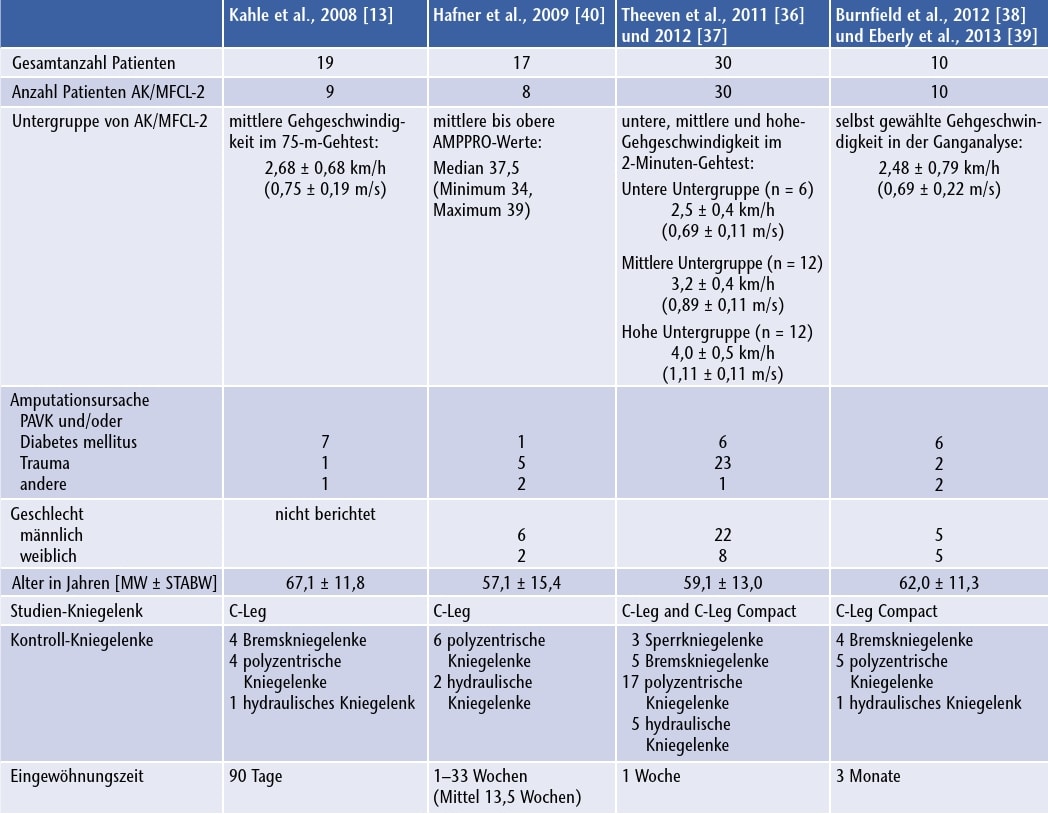 Somit ergab die Literatursuche sieben Publikationen über fünf klinische Studien mit einseitig oberschenkelamputierten Probanden mit Mobilitätsgrad AK/MFCL‑2. Zwei klinische Studien, die Gegenstand von vier Publikationen waren, untersuchten ausschließlich Patienten mit Mobilitätsgrad AK/MFCL‑2 47 48 49 50. Zwei Studien berichteten Untergruppenanalysen für Probanden der AK/MFCL‑2 51 52, und eine Studie enthielt Rohdaten, die eine Post-hoc-Analyse der Untergruppe AK/MFCL‑2 ermöglichte 53. Drei Studien 54 55 56 untersuchten den Nutzen des C‑Leg mit MP-Stand- und Schwungphasensteuerung, eine Studie 57 58 das C‑Leg Compact mit MP-Standphasensteuerung und eine Studie 59 60 sowohl das C‑Leg als auch das C‑Leg Compact in randomisierter Reihenfolge.
