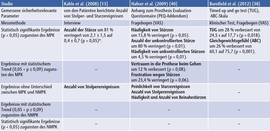 Drei Studien 62 63 64 mit insgesamt 27 Patienten berichteten Ergebnisse zur Sicherheit des Prothesengebrauchs (Tab. 2). Alle drei Studien waren von mittlerer methodischer Qualität. Da die Sicherheit bei eingeschränkten Außenbereichsgehern infolge ihrer verminderten funktionellen Leistungsfähigkeit von äußerster klinischer Wichtigkeit ist und die Zahl der Patienten in den analysierten Studien eher klein war (≤ 10), wurden in diesem Bereich nicht nur signifikante Unterschiede (p < 0,05), sondern auch statistische Trends (p ≤ 0,09) berücksichtigt, da diese möglicherweise nur deshalb keine Signifikanz erreichten, weil die Studiengruppen zu klein waren.