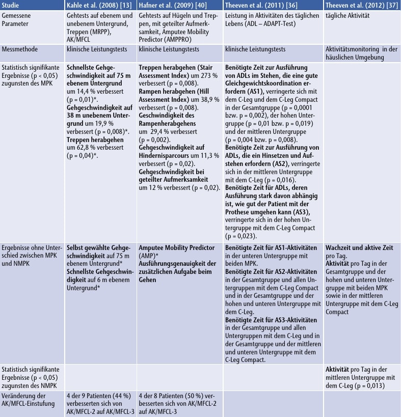 Insgesamt wurden in den Studien 51 leistungsbasierte Parameter und 40 biomechanische Gangparameter zur Funktionalität und Mobilität untersucht. Davon wies nur ein einziger Parameter, nämlich das Aktivitätsausmaß pro Tag in der mittleren Untergruppe in der Studie von Theeven et al. 88, einen signifikanten Unterschied zugunsten der NMPKs auf. Für 23 leistungsbasierte Parameter (45 %) und 22 biomechanische Gangparameter (55 %) konnten keine Unterschiede zwischen den Kniegelenken festgestellt werden. Für 28 leistungsbasierte Parameter (55 %) und 18 biomechanische Gangparameter (45 %) konnte dagegen eine signifikante Verbesserung bei Nutzung eines MPK nachgewiesen werden. Besonders bemerkenswert ist dabei, dass die Patienten der AK/MFCL‑2 insbesondere bei Außenbereichsaktivitäten Verbesserungen aufwiesen, wie z. B. beim Zurücklegen mittlerer Distanzen, beim Gehen auf unebenem Untergrund, auf Schrägen und Treppen, die nach den Mobilitätsklassifikationen für uneingeschränkte Außenbereichsgeher typisch sind.
