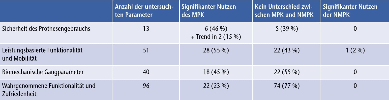 Zusammenfassend kann festgestellt werden, dass kein einziger der 96 untersuchten subjektiven Parameter eine Überlegenheit von NMPKs zeigte. Für die Mehrheit von 74 subjektiven Parametern (77 %) wurden keine Unterschiede zwischen den Kniegelenken festgestellt. Die Nutzung eines MPK führte bei 22 abgefragten validierten Parametern (23 %) zu signifikanten Verbesserungen. Eine Übersicht über die Zahl aller in den Studien untersuchten Parameter und ihre Ergebnisse vermittelt Tabelle 4.