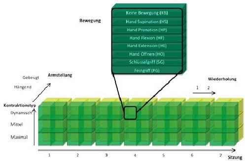 Für die Langzeituntersuchung wurde, wie in Abbildung 3 dargestellt, eine 8×3×2×2×7‑Matrix mit in Summe 672 Kontraktionen zu je 3 s Dauer in 6 Monaten aufgenommen. Zu Beginn jeder der 7 Sitzungen wurde die Prothese angelegt und erst nach Aufnahme aller 8 Bewegungen, 3 Kontraktionstypen, 2 Wiederholungen und 2 Armstellungen wieder abgelegt. Dazu wurde dem Probanden von der Aufzeichnungssoftware ein Bild einer unversehrten Gliedmaße mit der durchzuführenden Bewegung gezeigt. Die Kontraktionsstärke wurde vom Probanden subjektiv eingehalten und durch den Experimentator anhand des rohen EMG auf Plausibilität geprüft. Nach jeder Kontraktion wurde eine kurze Pause zur Vermeidung übermäßiger muskulärer Ermüdung und zur Vorbereitung auf die nächste Kontraktion eingehalten.