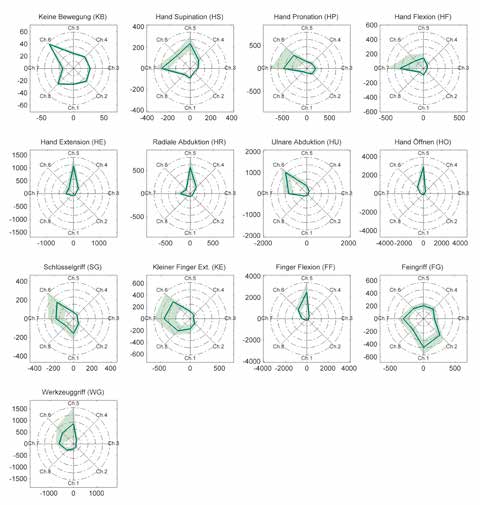 Im Gegensatz zu Unversehrten sind bei Amputierten zusätzlich zur abweichenden Anatomie oft Defizite in der neuralen Ansteuerung von Steuerbewegungen vorhanden. Der Proband und weitere Amputierte berichteten, sie könnten „nicht sehen, was sie tun”. Initiale Tests entsprechend dem erwähnten „einfachen Ansatz” ergaben hohe Performance, die aber nicht in Live-Tests umgesetzt werden konnte. Ursachen waren primär in geringer Unterschiedlichkeit und sekundär in geringer Reproduzierbarkeit der neuralen Ansteuerung zu finden. Zur Differenzierung und Festigung der Motorprogramme wurde das fehlende intrinsische Feedback durch ein visuelles ersetzt. Eine Möglichkeit, dies umzusetzen, sind Kontraktionsprofile mit Feedback der Kontraktionsstärke und dimensionsreduzierte Punktwolkendarstellungen 13. Die ausschließliche Darstellung der Kontraktionsstärke als Signalleistungssumme lässt jedoch kaum eine Aussage darüber zu, welche Muskeln aktiv sind. Das Feedback sollte für gleiche Steuerbewegungen gleich aussehen, auch wenn eine andere Bewegung geändert oder die ME neu trainiert wird. Diese scheinbar triviale Anforderung kann mit Punktwolkendarstellungen durch Dimensionsreduktion mit Principal Components Analysis (PCA) oder LDA nicht eingehalten werden, da die Projektionsrichtung datenabhängig ist. Die gewählte Lösung bestand darin, die Muster der Steuerbewegungen ohne Projektion als Sterndiagramm aller 8 Signalleistungen darzustellen (Abbildung 4 zeigt normierte Muster). Darin erhält jede Steuerbewegung eine Zuordnung zu einer bestimmten, charakteristischen Form (Polygon), die durch variierende Kontraktionsstärke zwar skaliert, aber kaum verändert wird. Neben dem Probanden kann auch der Experimentator bzw. Therapeut vom Sterndiagramm profitieren: Durch Zuordnung des Sensorringes zum Sterndiagramm und wiederum dessen Zuordnung zum muskulären Unterarmquerschnitt (Abb. 1) ist eine Interpretation der aktiven Muskeln möglich. Dadurch kann einfach erkannt werden, ob der Proband die physiologisch richtigen Muskeln nutzt, wie stark die Kontraktion ist und ob unerwünschte Ko-Kontraktionen vorliegen.