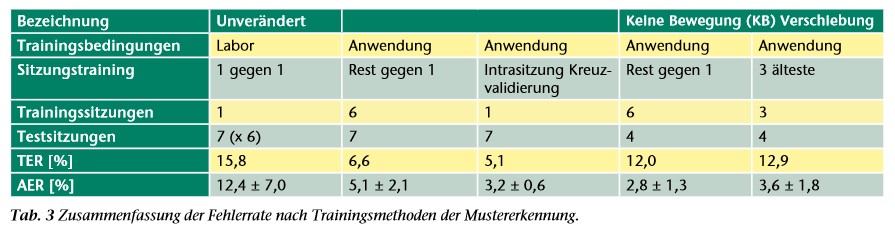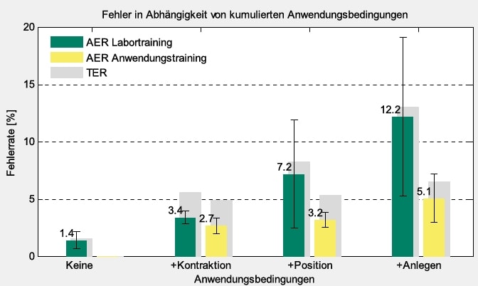 Zur Ermittlung der Fehlerraten wurden die zu analysierenden Kontraktionen in Test- und Trainingsdaten aufgeteilt. Mit Letzteren wird die ME trainiert und gegen Erstere getestet. Für jene Untersuchungen, in denen Test- und Trainingsdaten gleich waren, z. B. die Fehlerrate in einer Sitzung, wurde Kreuzvalidierung angewendet. Dabei wird jede Kontraktion einzeln gegen alle restlichen getestet und anschließend gemittelt. Kontraktionen wurden nicht zerteilt, um Ergebnisverfälschung durch ähnliche Test- und Trainingsdaten auszuschließen. Das ME-Training unter Laborbedingungen wurde mit statischer Kontraktion, hängendem Arm, allen Wiederholungen und einer Sitzung durchgeführt. Die AER unter Laborbedingungen ist die Referenz für die folgenden Messungen und wurde mit dem gleichen EMG wie beim Training mit Kreuzvalidierung ermittelt. Dies wurde für alle Sitzungen wiederholt, um die finalen Fehlerraten als Sitzungsmittelwert zu erhalten. Um den Einfluss der Anwendungsbedingungen zu ermitteln, wurden bei unveränderter ME (gleichbedeutend mit Laborbedingungen) sukzessive mehr Anwendungsbedingungen getestet. Für den Einfluss der Kontraktionsstärke wurden zum Test alle Kontraktionen verwendet. Für den Einfluss der Armstellung wurden zusätzlich alle Armstellungen verwendet, womit alle vorhandenen Kontraktionen pro Sitzung getestet wurden. Für den Einfluss des Anlegens der Prothese wurden schließlich alle Sitzungen außer der trainierten getestet („trainiere 1″). Dies entspricht dem Praxisfall, dass eine Prothese angelegt wird, ohne dass die ME neu trainiert wird. Daher können keine Kontraktionen aus einer Testsitzung in der Trainingssitzung vorhanden sein.