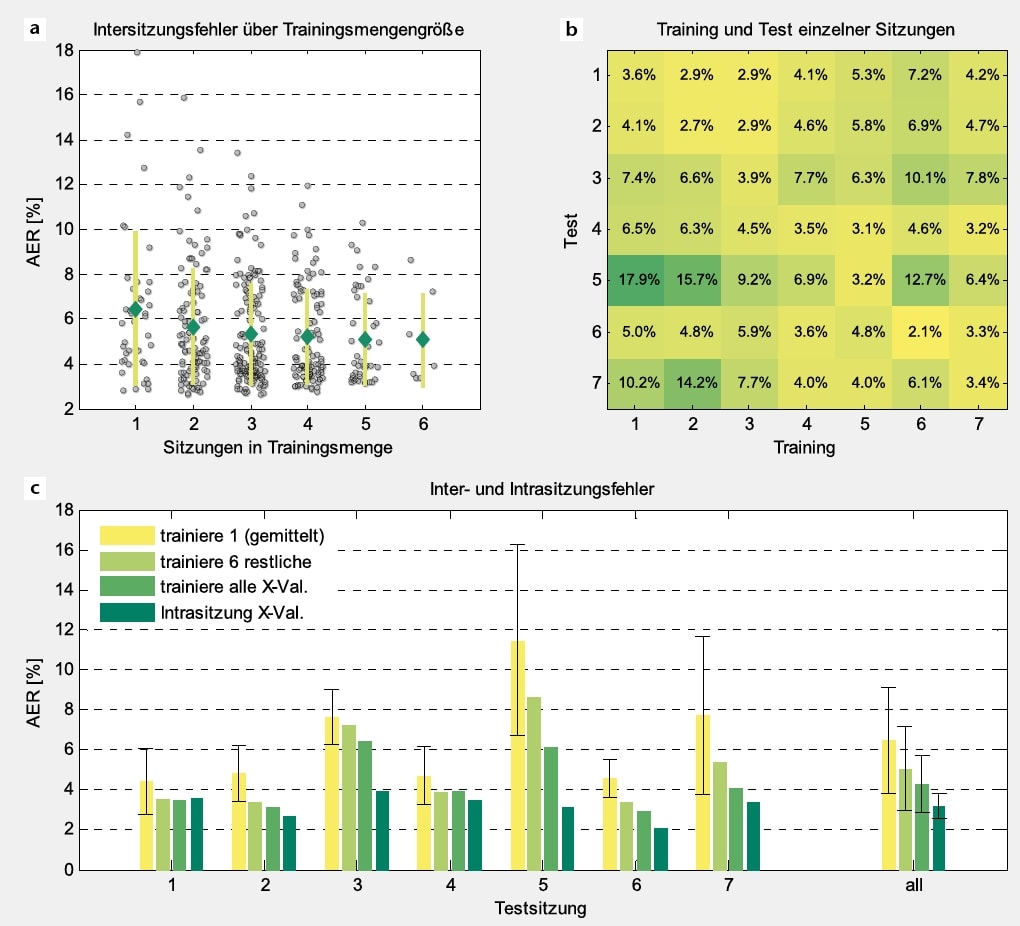 Inter- und Intrasitzungsfehler werden in Abbildung 6 abhängig vom Trainingsaufwand dargestellt. Die Hauptdiagonale in Abbildung 6b zeigt die Intrasitzungsfehler. Wenn die Prothese also nach jedem Anlegen mit allen Anwendungsbedingungen trainiert wird, ist die AER nie größer als 4 %. Felder abseits der Hauptdiagonale entsprechen dem Intersitzungsfehler und werden in a) bei x = 1 gesammelt dargestellt. Bei ME-Training vor dem Anlegen reichen maximale Fehler bis 18 %, können jedoch durch Verwenden größerer Trainingssets auf 8 % bei 6 Sitzungen begrenzt werden. Der mittlere Fehler lässt sich dadurch aber nur von 6,5 auf 5,1 % verringern. Wird die aktuelle, d. h. die getestete, Sitzung hinzugenommen („trainiere alle X‑Val.”), sinkt der mittlere Fehler auf 4,3 % und kommt damit nicht unter den Intrasitzungsfehler (Mittelwert der Hauptdiagonale) von 3,2 %.