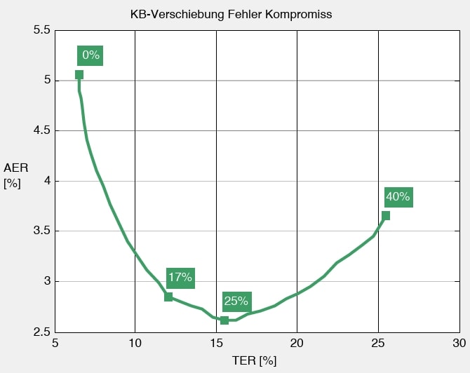 Es ist aus Anwendersicht vorteilhaft, wenn die Prothese im Zweifelsfall statt einer falschen Bewegung keine macht 16. Da die Fehlerrate bei schwachen Kontraktionen tendenziell höher als bei kräftigen ist 17, kann die AER (auf Kosten höherer TER) potenziell gesenkt werden, indem die Prothese bei sehr schwachen Kontraktionen keine Bewegung ausführt. Dies kann im ME-Training durch Verschiebung von Bewegungsanteilen unterhalb eines Leistungsschwellwertes in die „Keine-Bewegung”-Klasse umgesetzt werden. Abbildung 7 zeigt den Zusammenhang aus AER und TER, wenn beginnend von 0 % EMG immer mehr schwaches EMG verschoben wird. Der erste Punkt bei 5,1 % AER und 0 % Verschiebung entspricht den „Trainiere-6-restliche”-Fällen aus Abbildung 5 und Abbildung 6. Die AER fällt steil ab und erreicht bei 16 % TER ihr Minimum von 2,6 %. Eine Verschiebung von 17 % reduziert die AER auf 2,8 % und wurde als Kompromiss bei einer verdoppelten TER von 12 % gewählt. Demzufolge reagiert die Prothese bei den schwächsten 9,4 % der Kontraktionen mit keiner Bewegung.