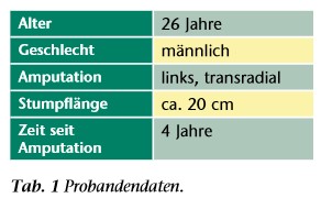 Der Proband (Tab. 1) hatte eine elektive Amputation der oberen Extremität nach einer erfolglosen plastischen Rekonstruktion aufgrund eines Starkstromunfalls 10. Durch den Unfall musste ein Großteil der Flexoren im Unterarm entfernt werden. Der Stumpf weist keine sichtbaren Atrophien in der erhaltenen Muskulatur auf. Im Elektrodenbereich ist teilweise einzugsfreies Narbengewebe auf der Haut vorhanden, das aber auch bei Kontraktion keinen Elektrodenkontaktverlust verursacht.