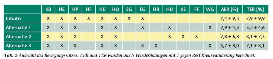 Der Proband berichtete von einem unangenehmen Gefühl, einem Kribbeln, bei der Flexion. Diese wies auch eine niedrige EMG-Amplitude (Abb. 2) sowie geringe Reproduzierbarkeit auf. Bei Betrachtung der erläuterten Amputationsdaten erscheint dies plausibel. Ähnlich dazu variierte der Schlüsselgriff stark und wurde mit dem Feingriff verwechselt, obwohl der Proband hier kein unangenehmes Gefühl anführte. Tabelle 2 zeigt alle Bewegungen aus Abbildung 4 und die daraus gebildeten Bewegungssätze. Der intuitive Bewegungssatz hat eine relativ hohe AER von 7,4 % (TER 7,9 %). Die alternativen Bewegungssätze 1 bis 3 weisen AER von 2,9 bis 7,8 % auf. „Alternativ 1″ ersetzt die problematische Flexion mit Ulnarabduktion, eine physiologisch naheliegende und vom Probanden als angenehm beschriebene Lösung. Der Schlüsselgriff wurde mit dem Werkzeuggriff ersetzt, da dieses Griffmuster den größten Unterschied zum Feingriff aufweist. Aus Sicht der geringen AER von 2,9 % ist dieser Ansatz sinnvoll. Hinter „Alternativ 2″ steht die Absicht, den Fehler durch alternative Griffmuster mit Finger-Flexion und Finger-Extension zu reduzieren. Leider ist die AER mit 7,8 % hoch. Auch „Alternativ 3″ (wie „Alternativ 1″, nur mit Radial- statt Ulnarabduktion) bringt mit 6,8 % AER keine nennenswerte Verbesserung. Die TER ist nur wenig höher als die AER (ähnlich 14). Um eine Prothese auch unter dem Einfluss von Anwendungsbedingungen zuverlässig zu steuern, ist es entscheidend, gut trennbare Muster zu verwenden. Es wurde der Bewegungssatz „Alternativ 1″ gewählt, da dieser weniger als 50 % der Fehlerraten aller anderen aufwies.