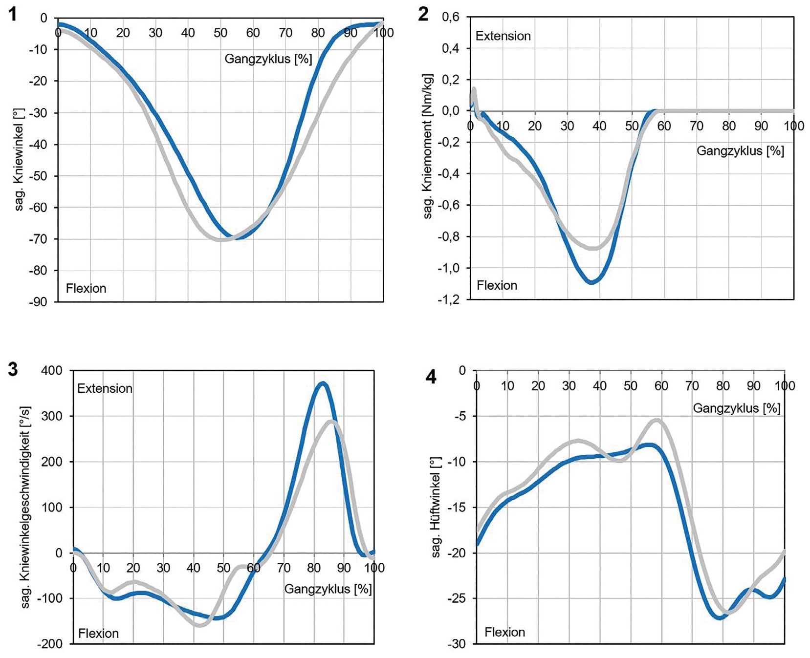 Bei Stufenkontakt war das Rheo Knee XC im Gruppenmittel 2° stärker flektiert als das C‑Leg. Ab ca. 25 % GZ beugte das Rheo Knee XC deutlich schneller ein. Die Streckung des Kniegelenks in der Schwungphase verlief mit dem C‑Leg schneller. Bei 100 % GZ befand sich das Rheo Knee XC noch in der Streckbewegung. Das maximale Knieflexionsmoment war mit dem C‑Leg etwa 27 % höher als mit dem Rheo Knee XC (Abb. 1, Tab. 2).