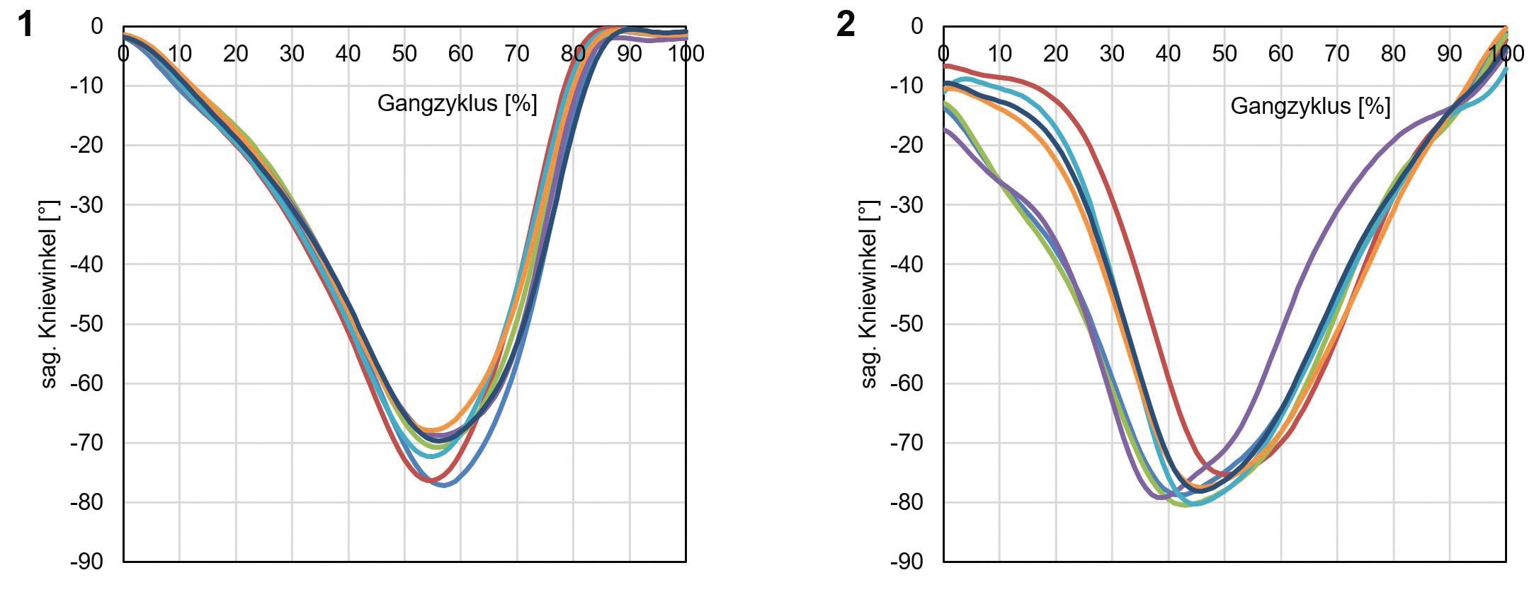 Für den Versuch „Kleine Schritte“ wurden zusätzlich jeweils die Schritte identifiziert, bei denen das Gelenk zu Beginn der Schwungphase nicht korrekt in den niedrigen Schwungphasenwiderstand schaltet. Eine Mittelwertbildung erscheint bei den Versuchen „Rückwärtsgehen“ und „Hängenbleiben des Fußes in der Schwungphase“ nicht zweckmäßig. Hier wurden die Einzelversuche analysiert, um das Verhalten der Kniegelenke in diesen Situationen zu charakterisieren. Ausführliche Beschreibungen zu den Kniegelenken und zur Methodik sind 31zu entnehmen.